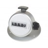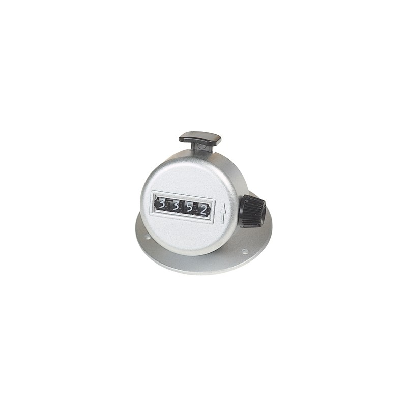 Con pomello zigrinato per il riporto rapido a zero. A 4 cifre, altezza 4,5 mm, per contare fino a 9.999 pezzi. Tipo rotondo da tavolo, con pulsante contapezzi e fori per fissaggio al banco da lavoro o a parete. H 5265/1 - Esecuzione in resina sintetica con base rimovibile per impiego nella mano.